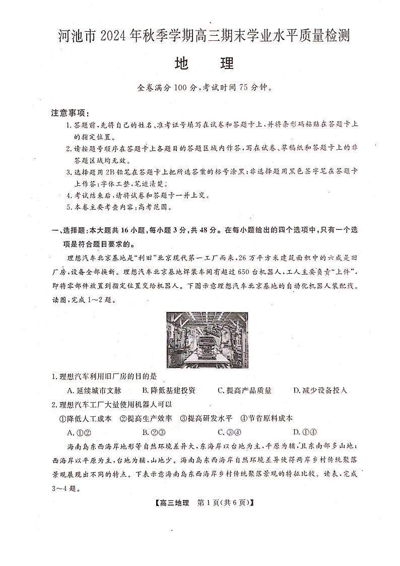 广西河池市2024年秋季学期高三年级期末教学质量检测地理