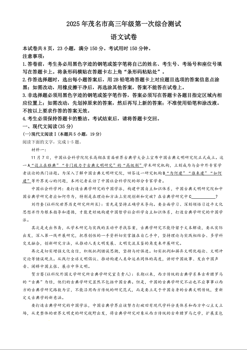 广东省茂名市2024-2025学年上学期1月高三第一次综合测试(一模)语文+答案