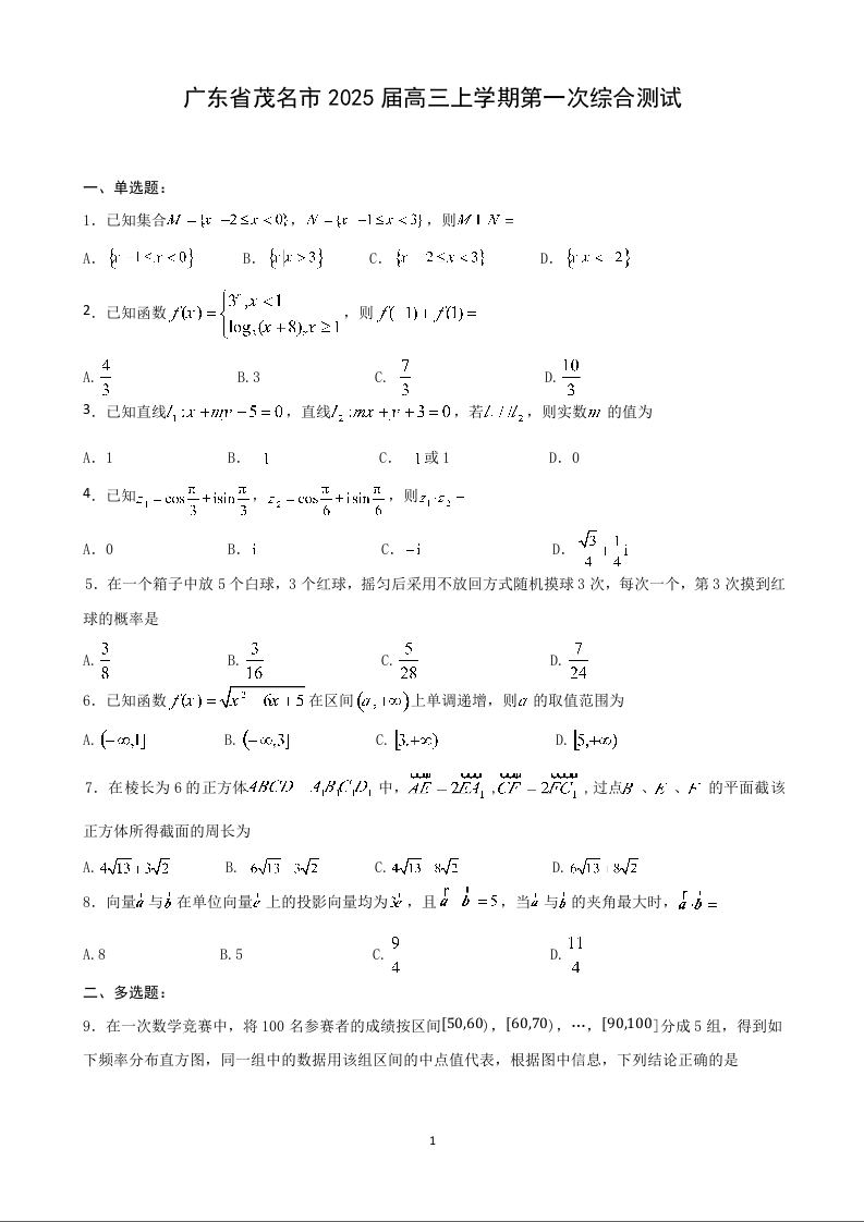 广东省茂名市2024-2025学年上学期1月高三第一次综合测试(一模)数学+答案