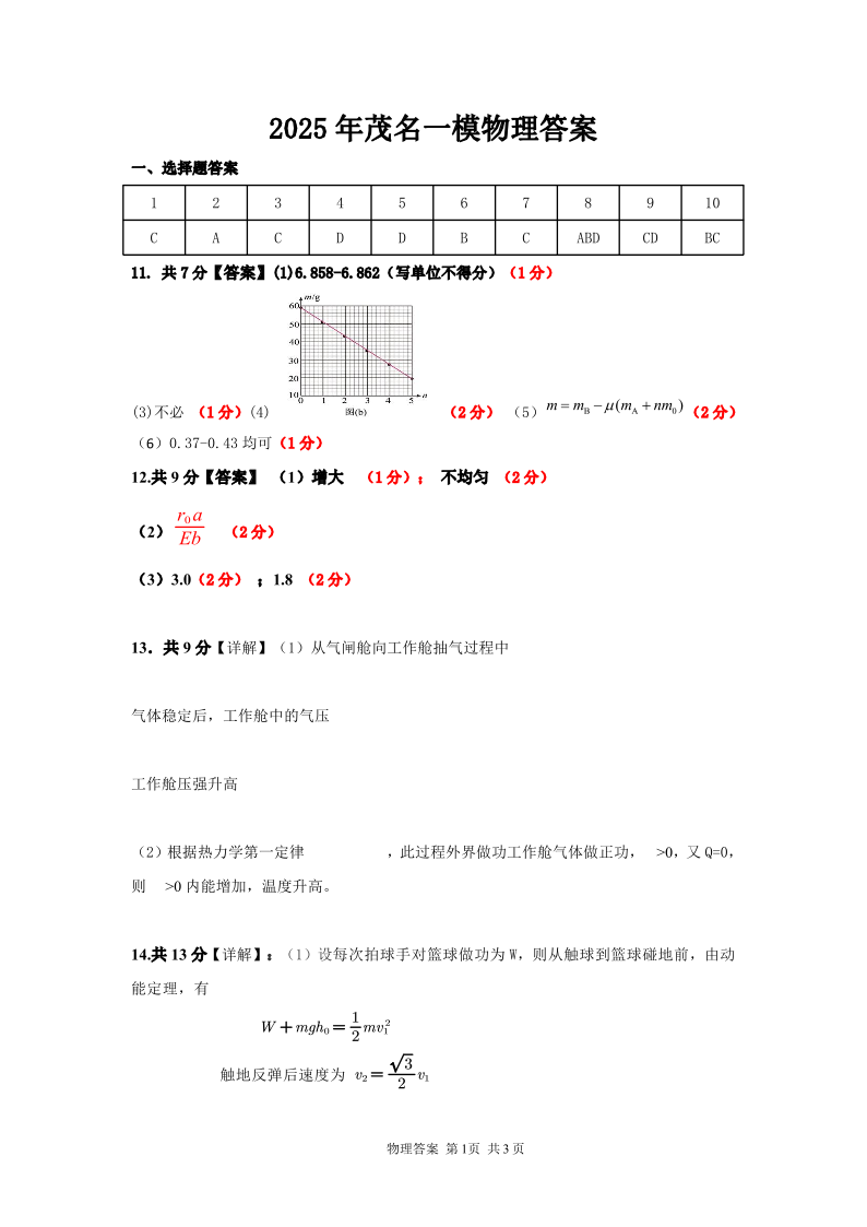 广东省茂名市2024-2025学年上学期1月高三第一次综合测试(一模)物理答案