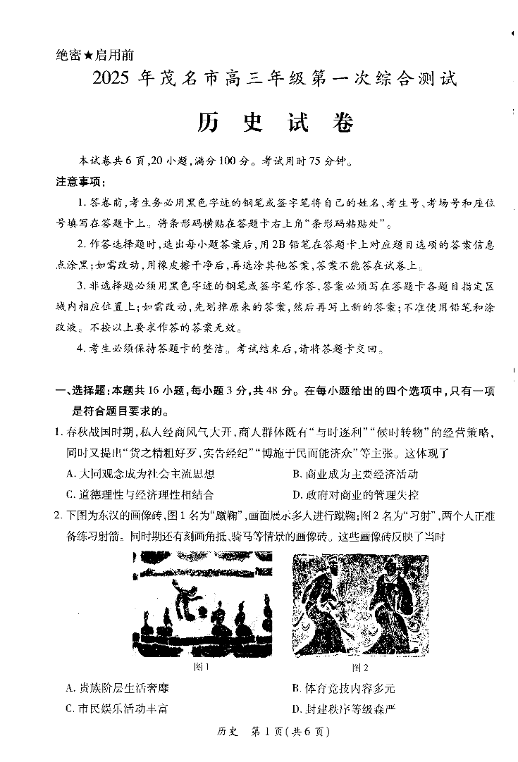 广东省茂名市2024-2025学年上学期1月高三第一次综合测试(一模)历史
