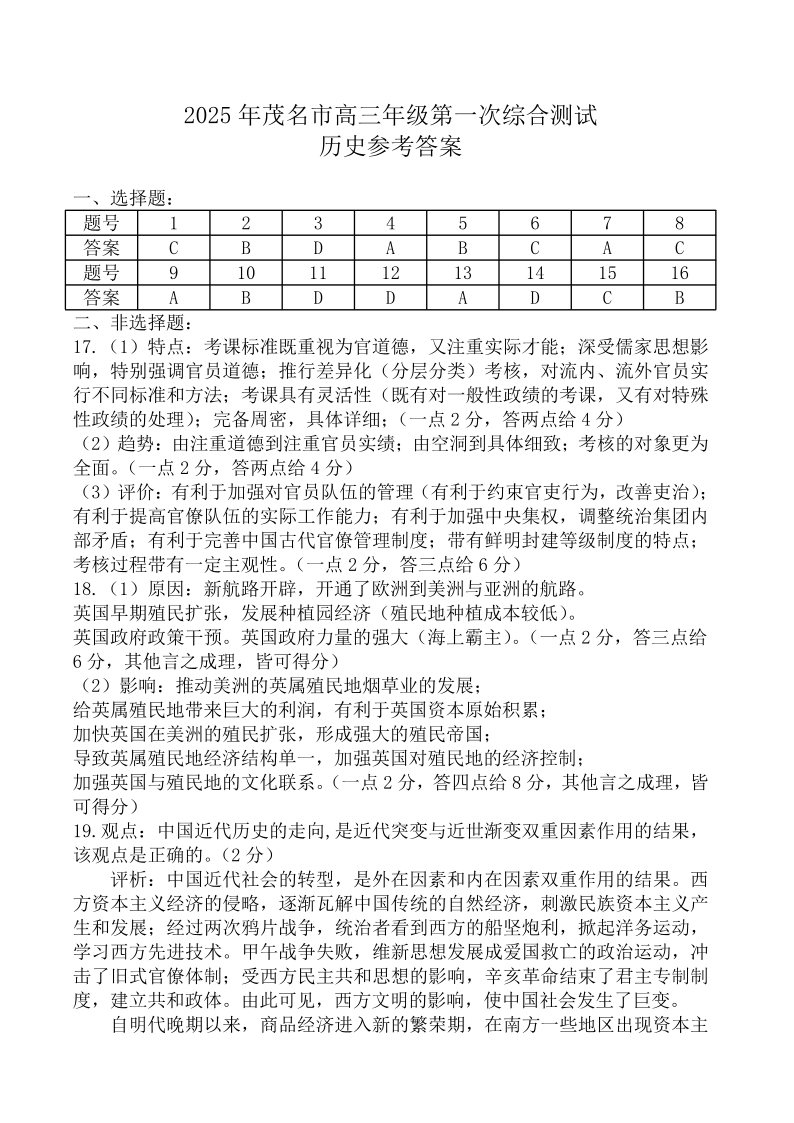 广东省茂名市2024-2025学年上学期1月高三第一次综合测试(一模)历史答案