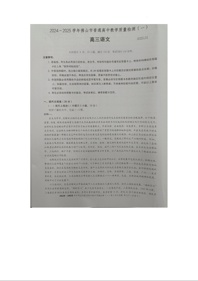 广东省佛山市2024-2025学年上学期1月高三教学质量检测(一模)语文
