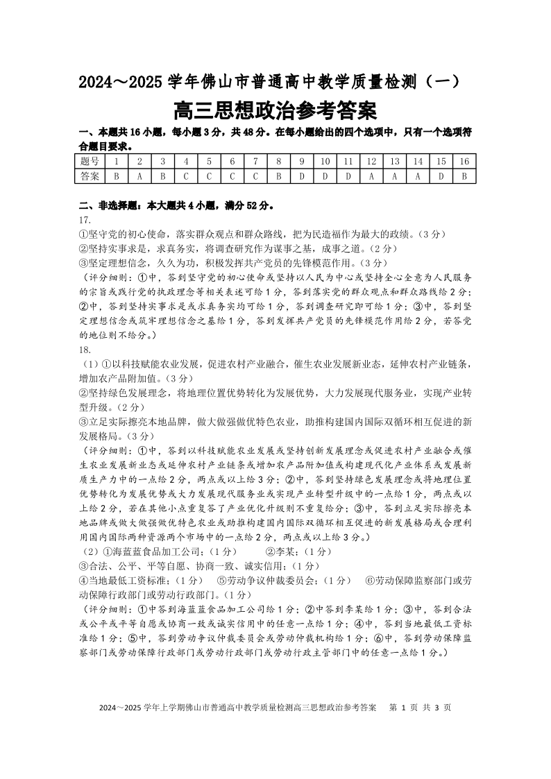 广东省佛山市2024-2025学年上学期1月高三教学质量检测(一模)政治答案