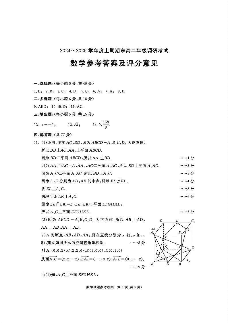 四川省成都市2024-2025学年上期高二期末统一调研考试数学答案