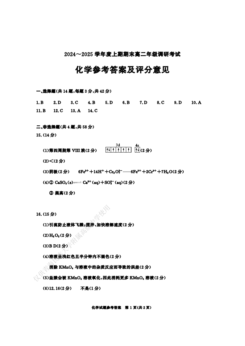 四川省成都市2024-2025学年上期高二期末统一调研考试化学答案