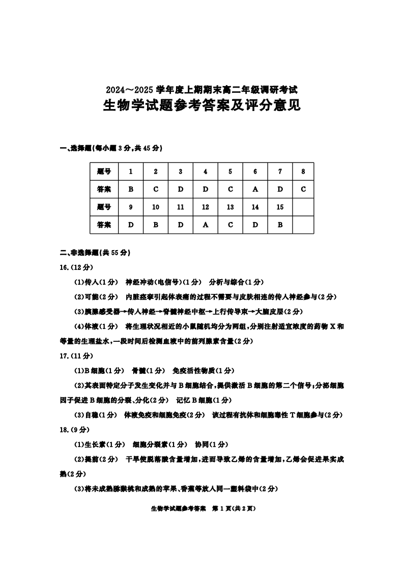 四川省成都市2024-2025学年上期高二期末统一调研考试生物答案