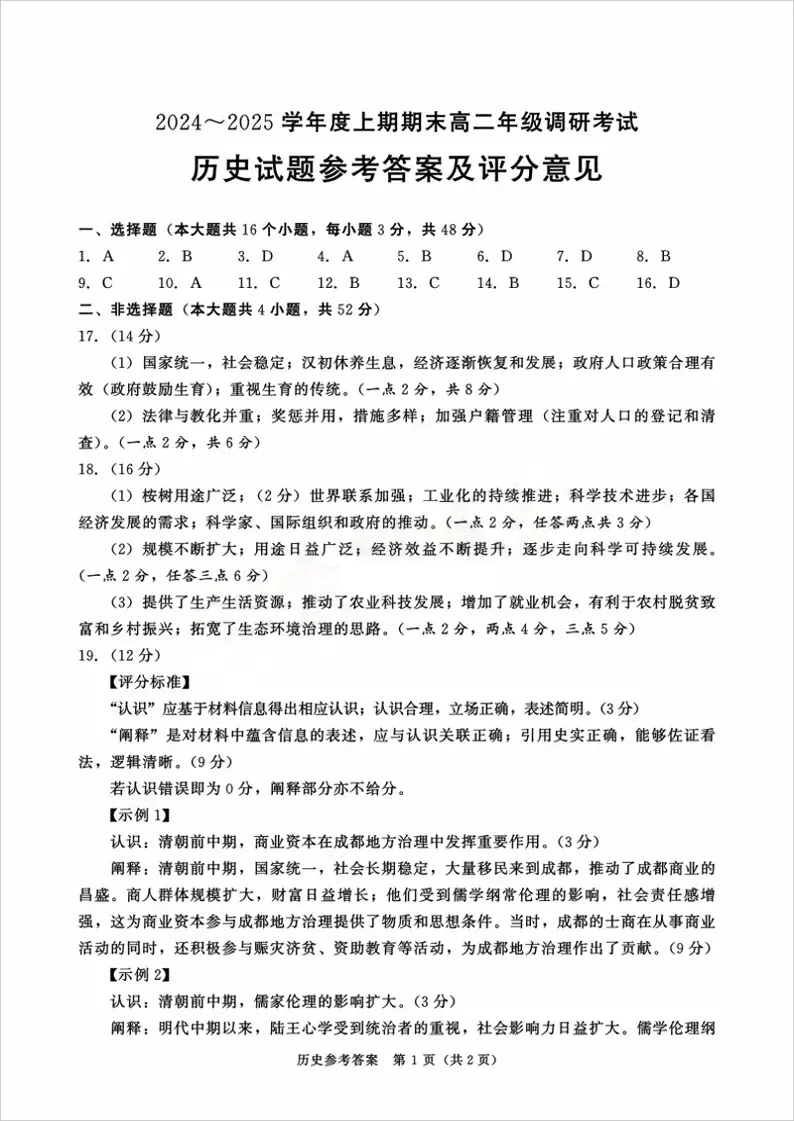 四川省成都市2024-2025学年上期高二期末统一调研考试历史答案
