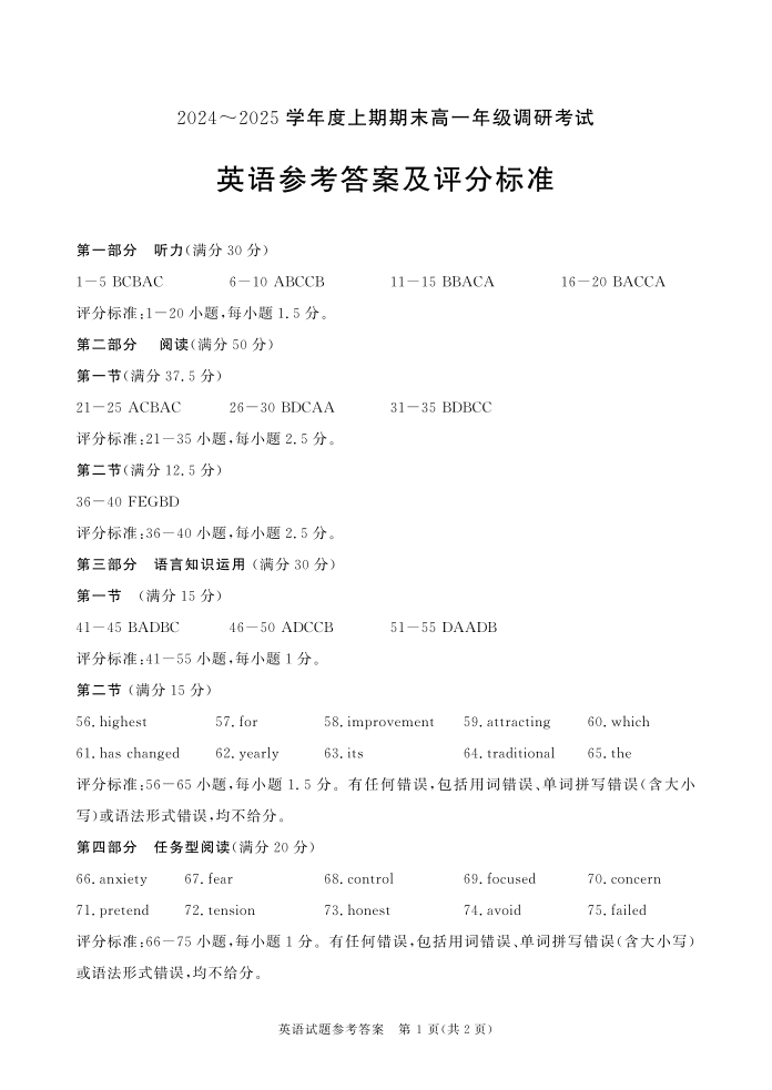 四川省成都市2024-2025学年上期高一期末统一调研考试英语答案