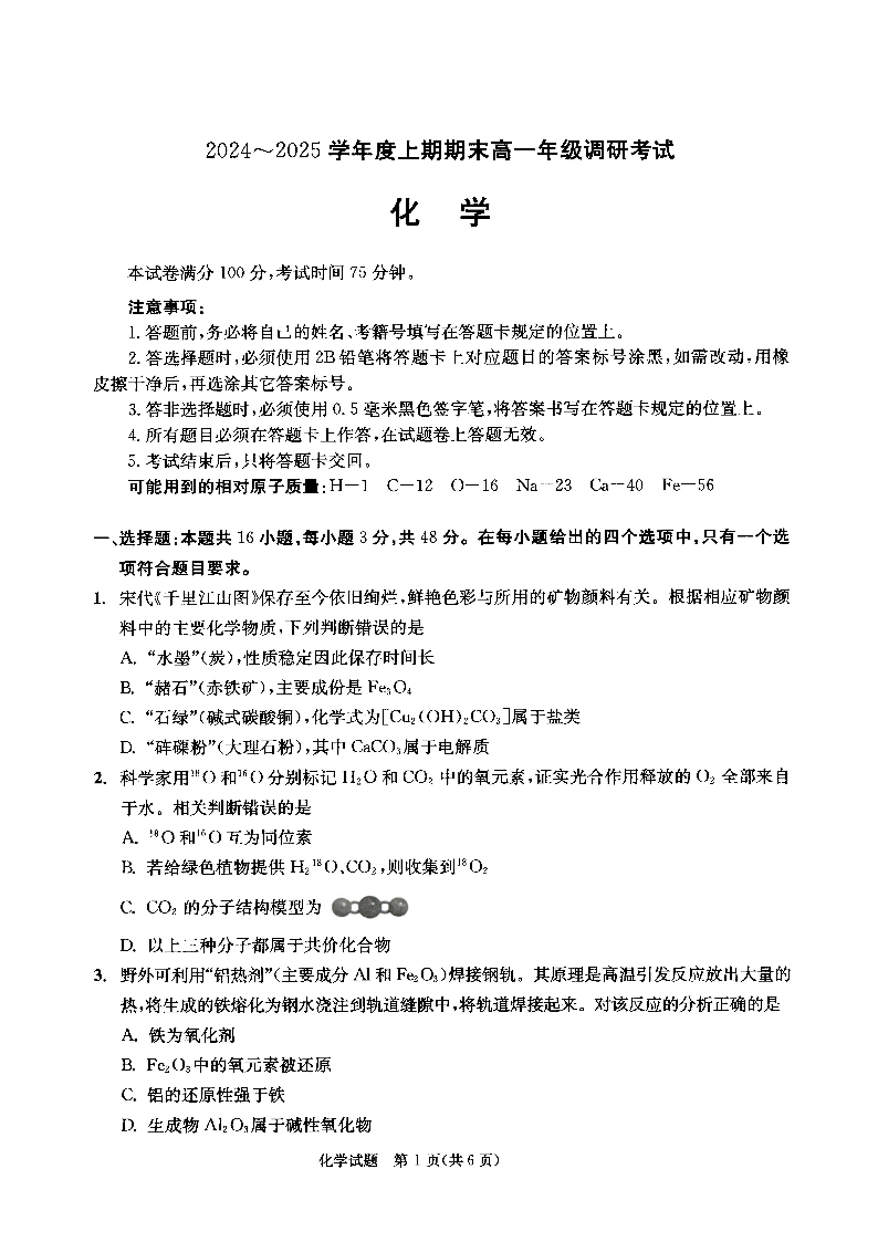 四川省成都市2024-2025学年上期高一期末统一调研考试化学