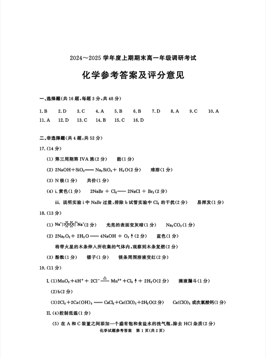 四川省成都市2024-2025学年上期高一期末统一调研考试化学答案