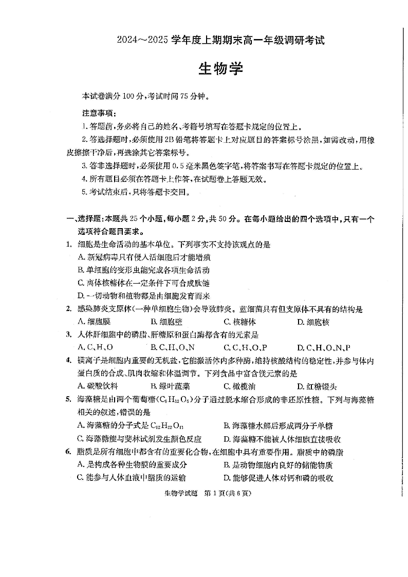 四川省成都市2024-2025学年上期高一期末统一调研考试生物