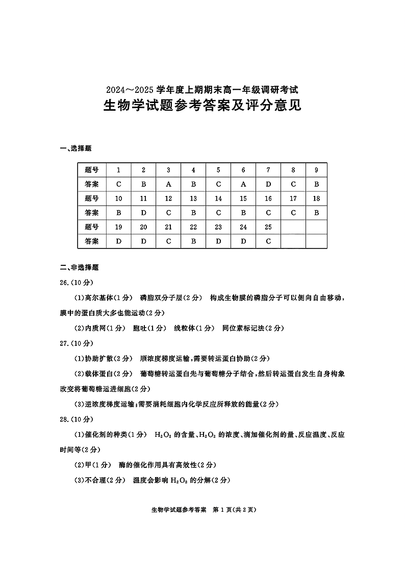 四川省成都市2024-2025学年上期高一期末统一调研考试生物答案