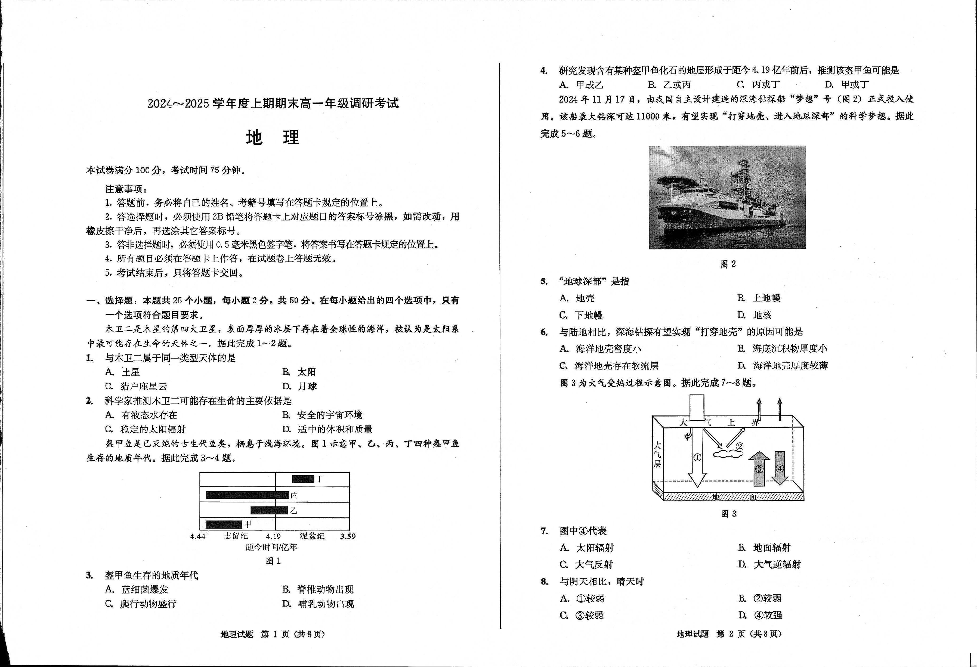 四川省成都市2024-2025学年上期高一期末统一调研考试地理