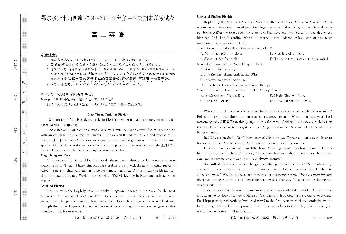 内蒙古鄂尔多斯市西四旗2024-2025学年高二上学期期末联考英语+答案