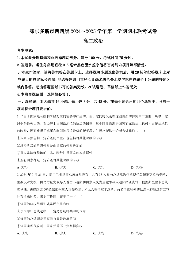 内蒙古鄂尔多斯市西四旗2024-2025学年高二上学期期末联考政治+答案