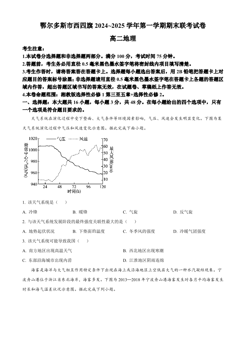 内蒙古鄂尔多斯市西四旗2024-2025学年高二上学期期末联考地理+答案