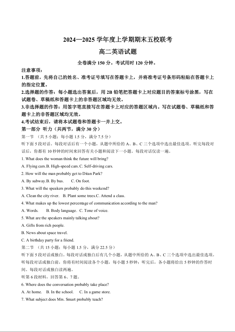 吉林省松原市五校2024-2025学年高二上学期期末联考英语+答案