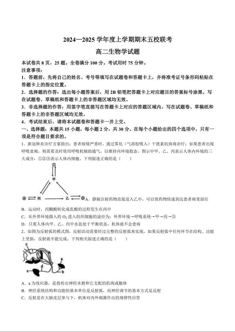 吉林省松原市五校2024-2025学年高二上学期期末联考生物+答案
