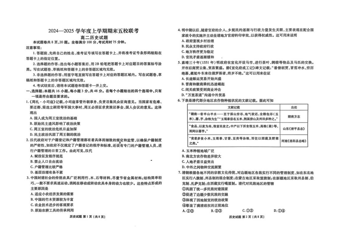 吉林省松原市五校2024-2025学年高二上学期期末联考历史+答案