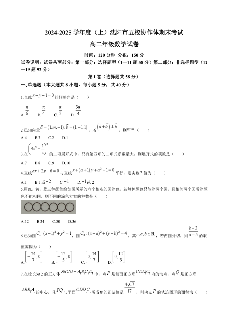 辽宁省沈阳市五校协作体2024-2025学年高二上学期期末联考数学+答案