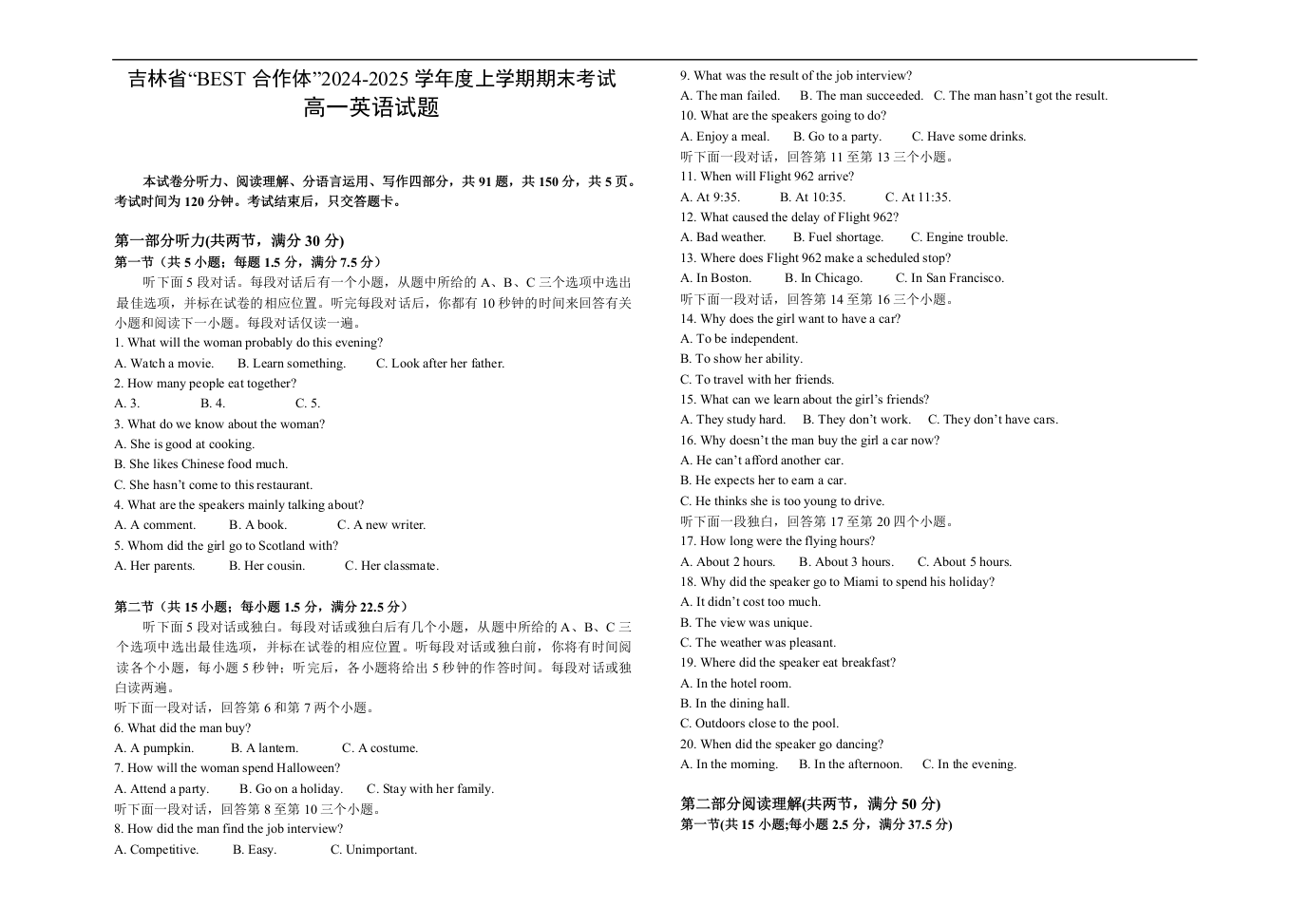 吉林省“BEST合作体”2024-2025学年高一上学期期末考试英语