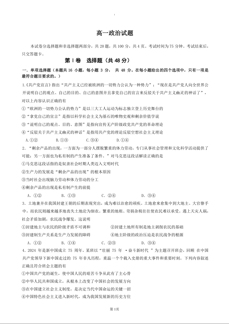 吉林省“BEST合作体”2024-2025学年高一上学期期末考试政治+答案