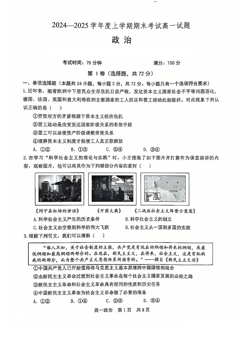 辽宁省普通高中2024-2025学年高一上学期1月期末考试政治+答案