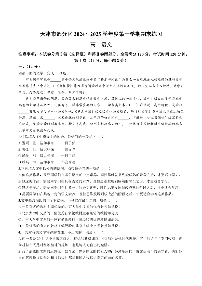 天津市部分区2024-2025学年上学期高一期末练习测试语文+答案