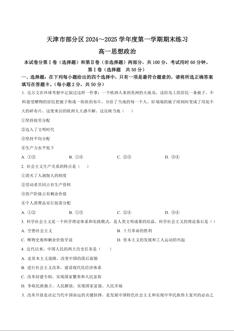 天津市部分区2024-2025学年上学期高一期末练习测试政治+答案