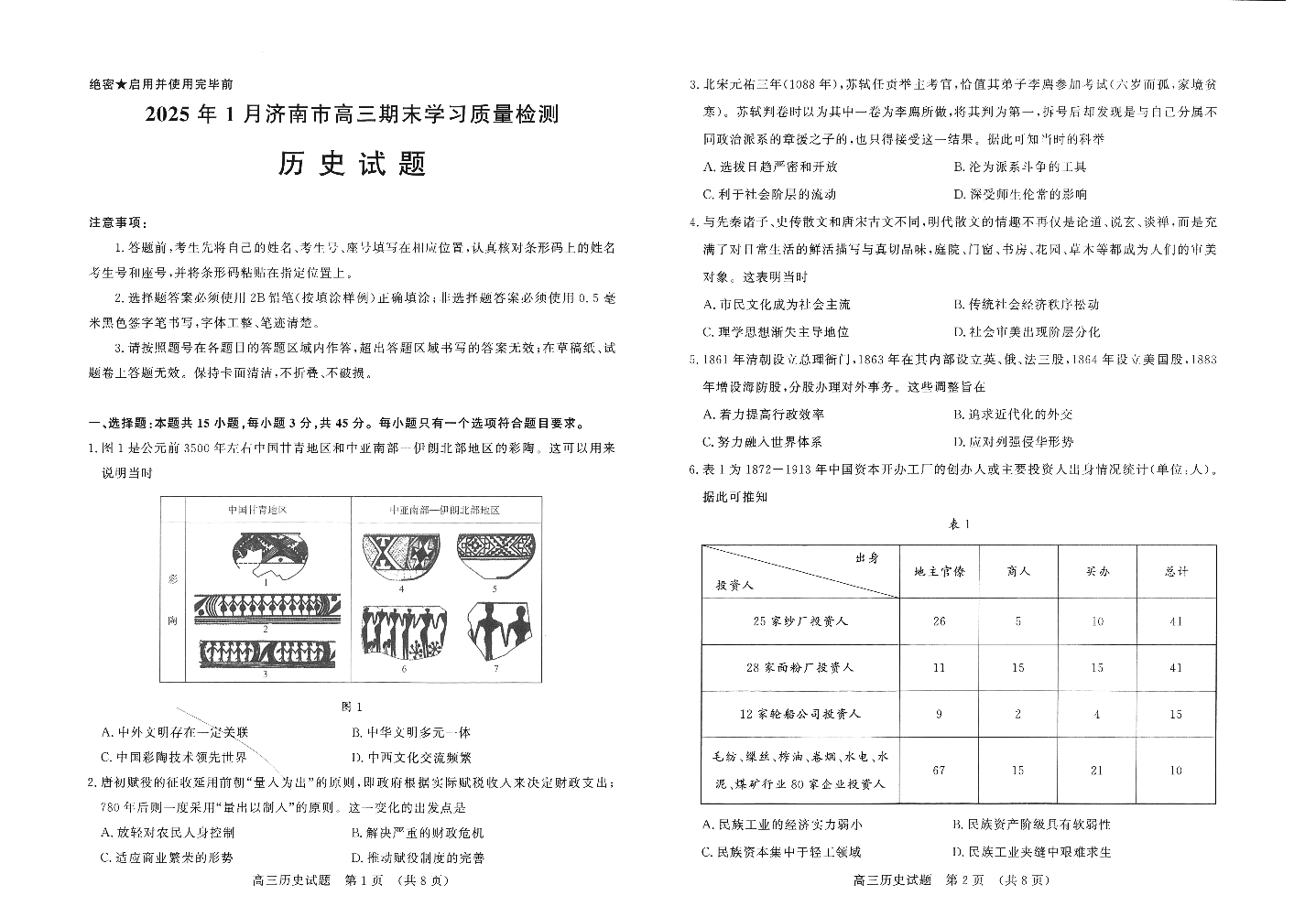 山东省济南市2024-2025学年上学期1月高三期末学习质量检测历史