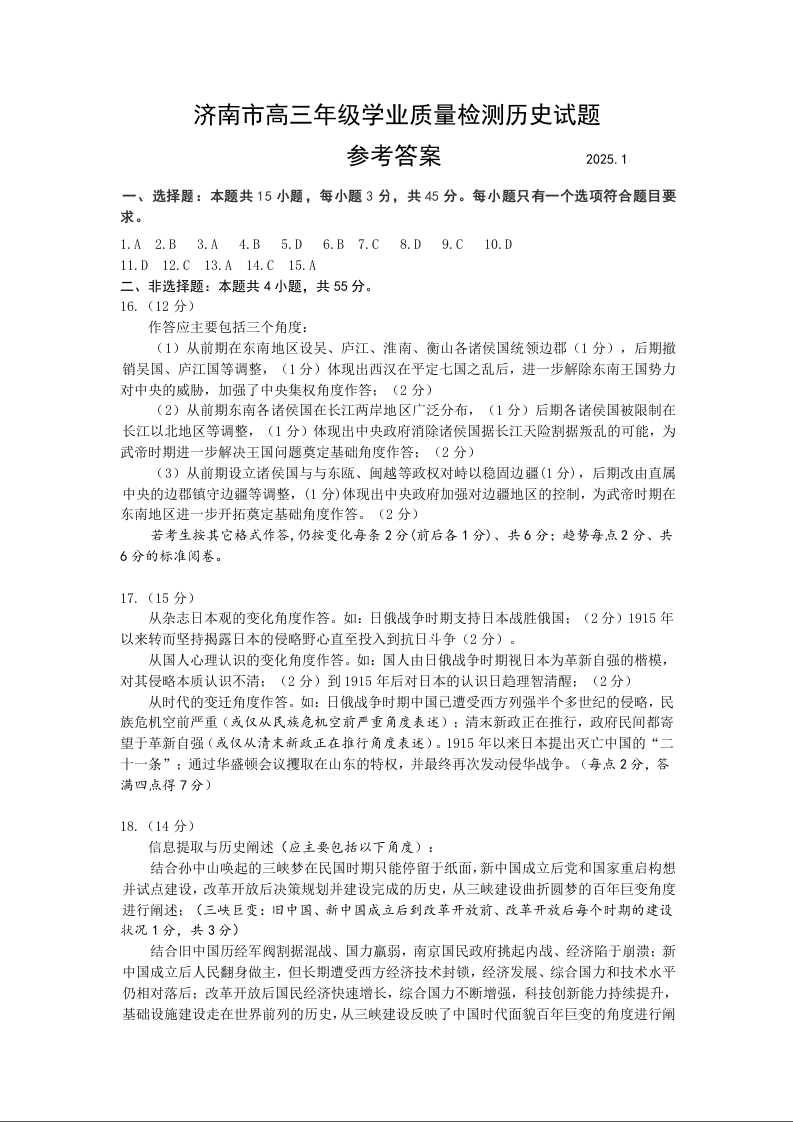 山东省济南市2024-2025学年上学期1月高三期末学习质量检测历史答案