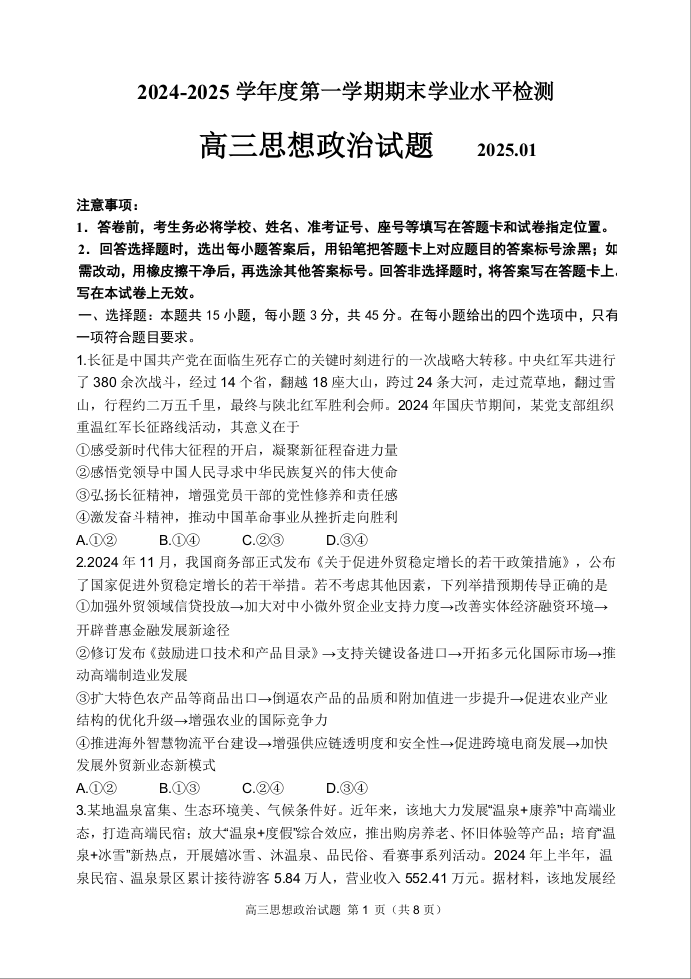 山东省青岛市2024-2025学年度第一学期高三期末学业水平检测政治