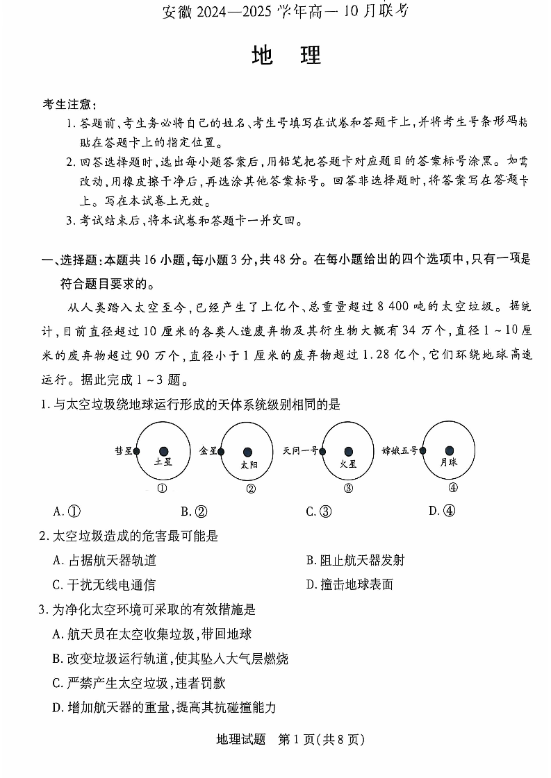 安徽省部分学校2024-2025学年高一上学期10月月考地理+答案