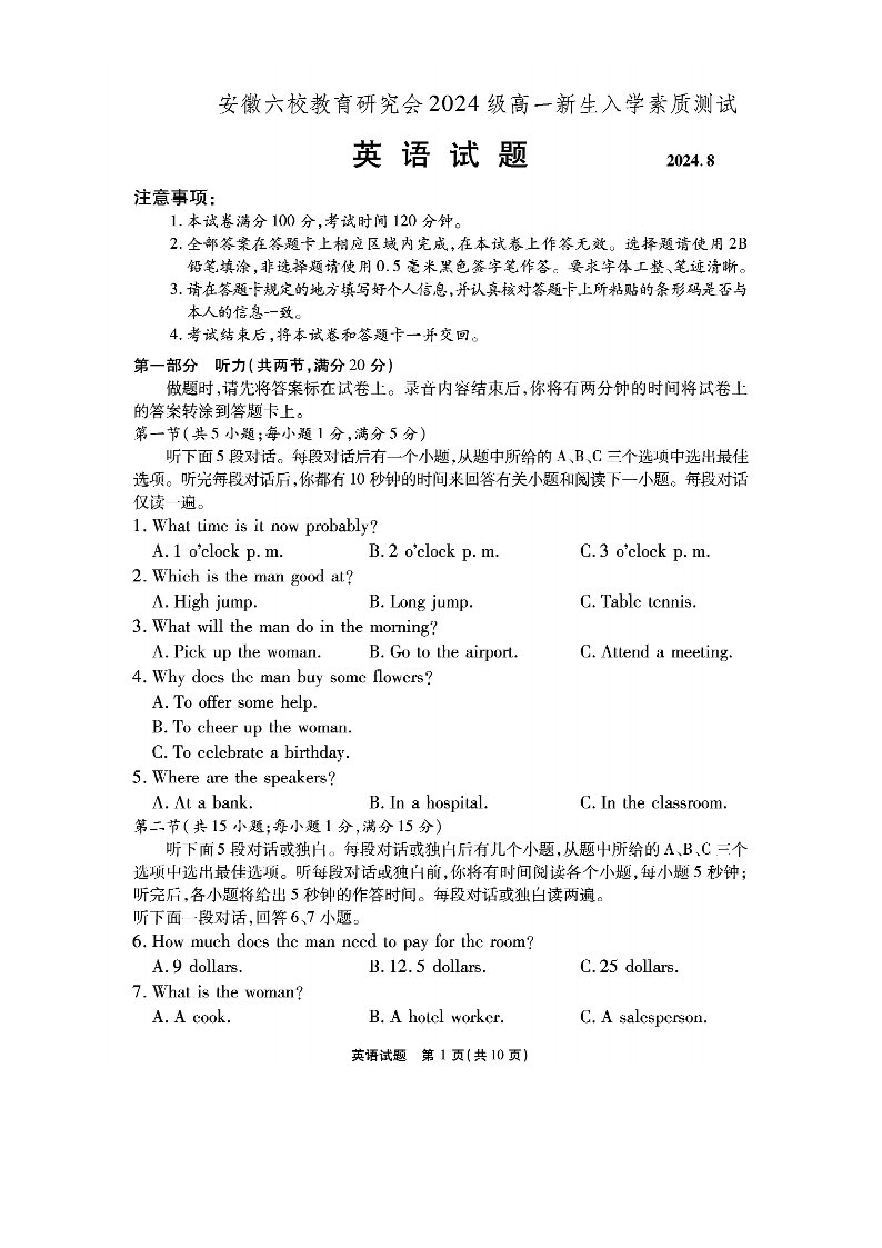 安徽省六校教育研究会2024级高一新生入学素质测试英语