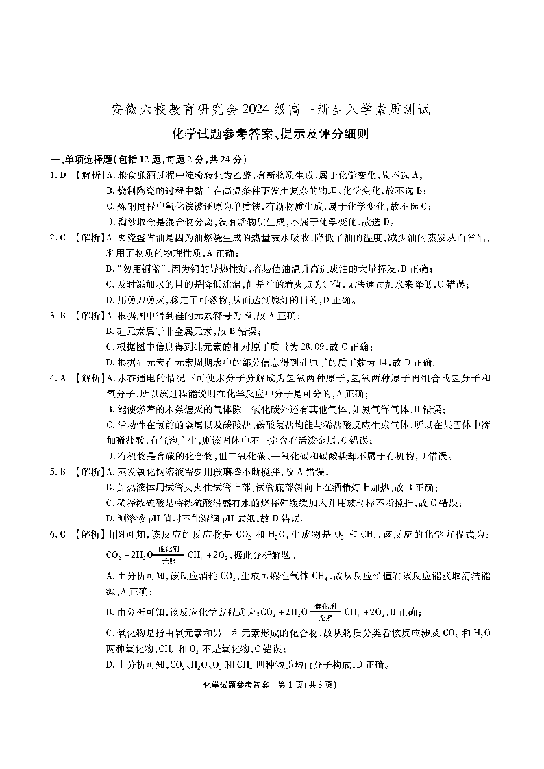 安徽省六校教育研究会2024级高一新生入学素质测试化学答案