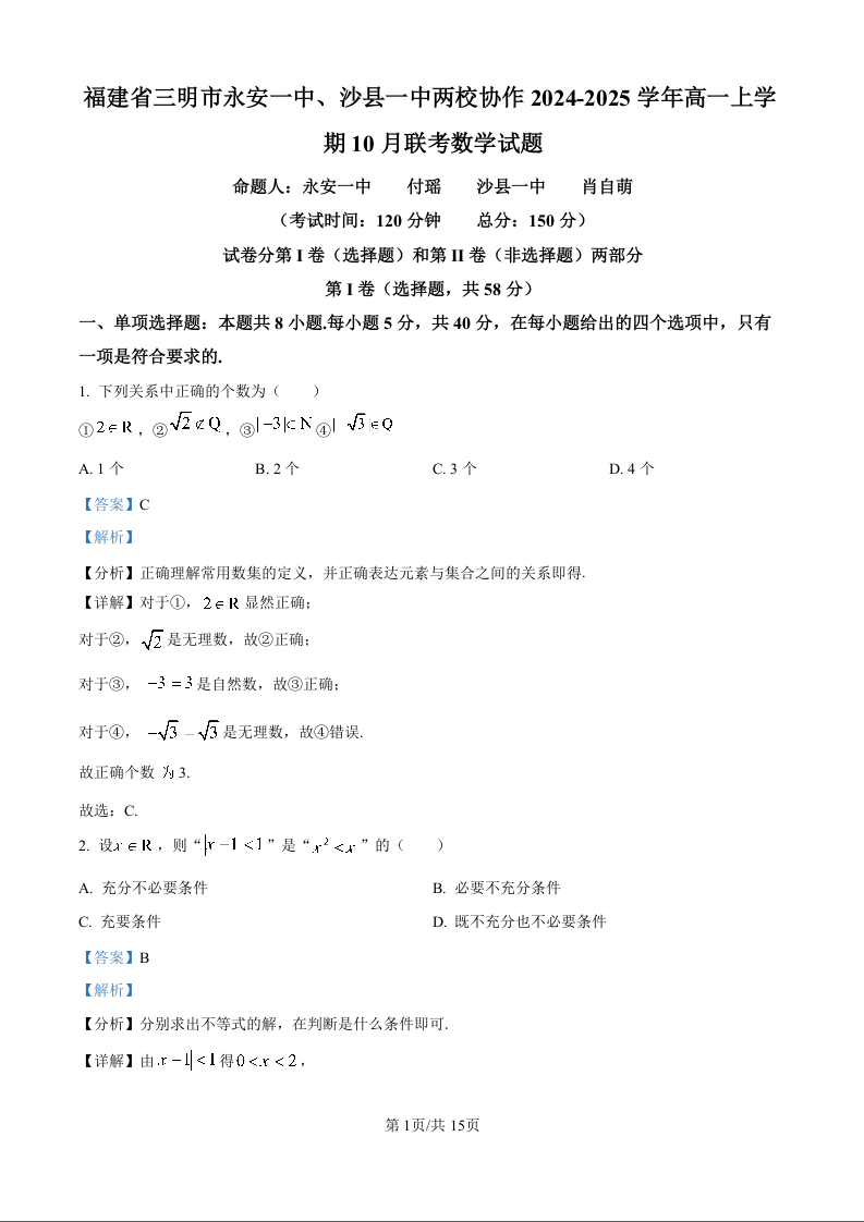 福建省三明市永安一中、沙县一中两校协作2024-2025学年高一上学期10月联考数学(解析版)