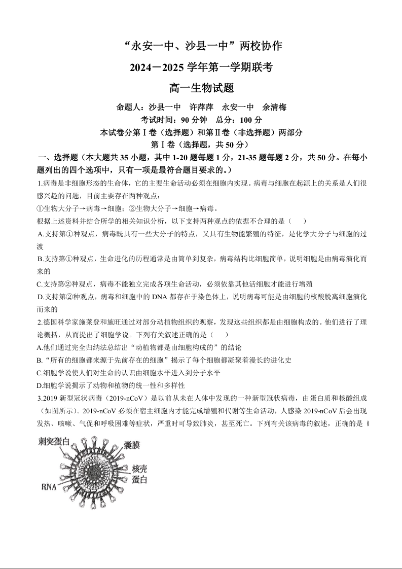 福建省三明市永安一中、沙县一中两校协作2024-2025学年高一上学期10月联考生物