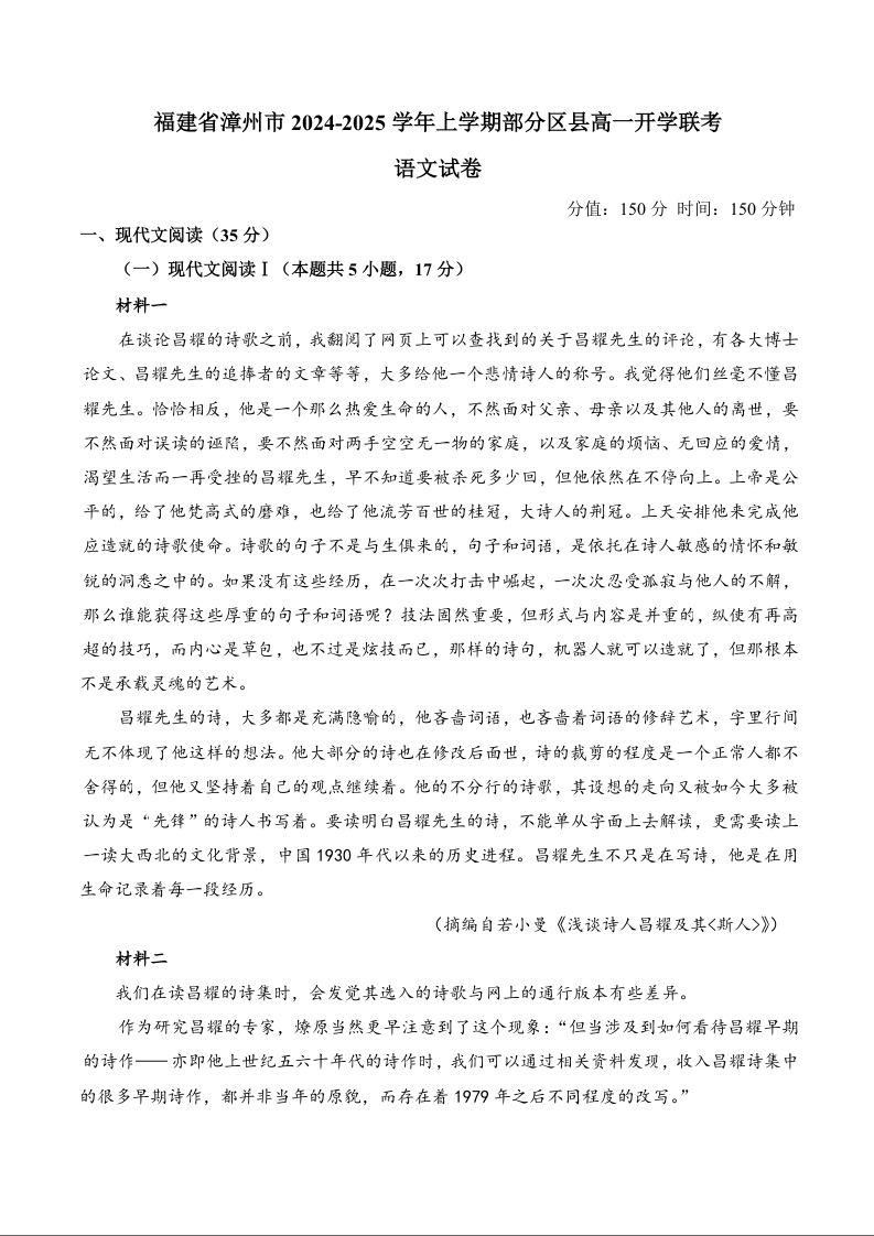 福建省漳州市2024-2025学年上学期部分区县高一开学联考语文 (解析版)