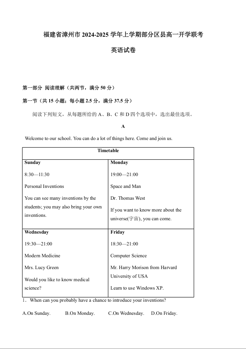 福建省漳州市2024-2025学年上学期部分区县高一开学联考英语 (解析版)