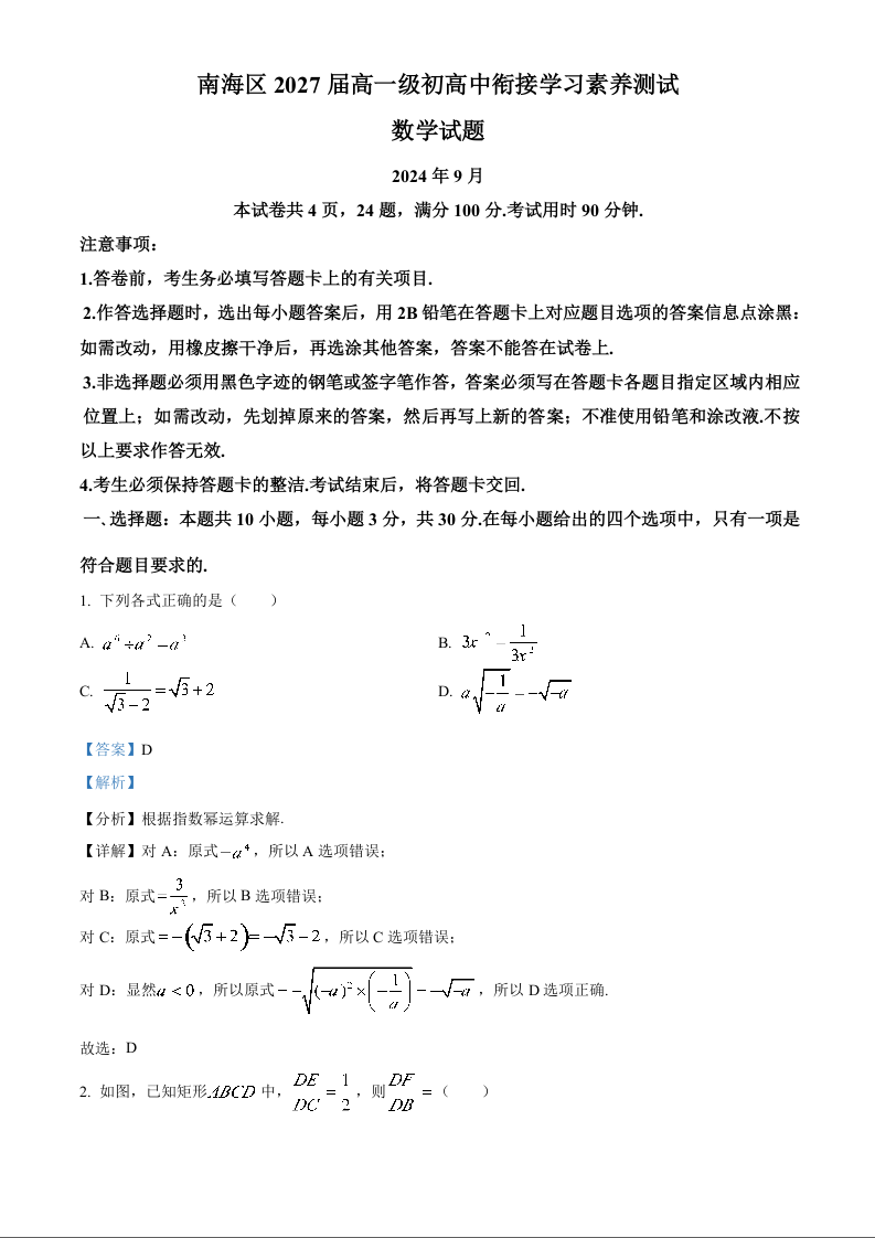 广东省佛山市南海区2027届高一级初高中衔接学习素养测试数学(解析版)