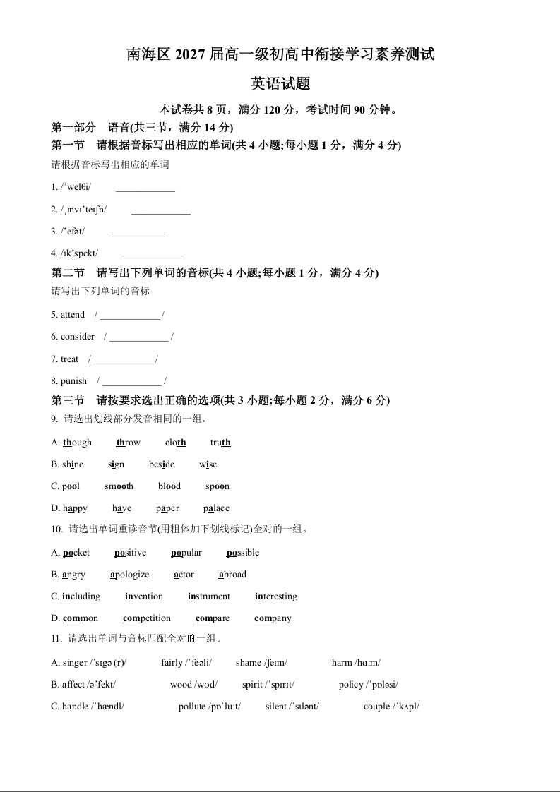 广东省佛山市南海区2027届高一级初高中衔接学习素养测试英语(原卷版)