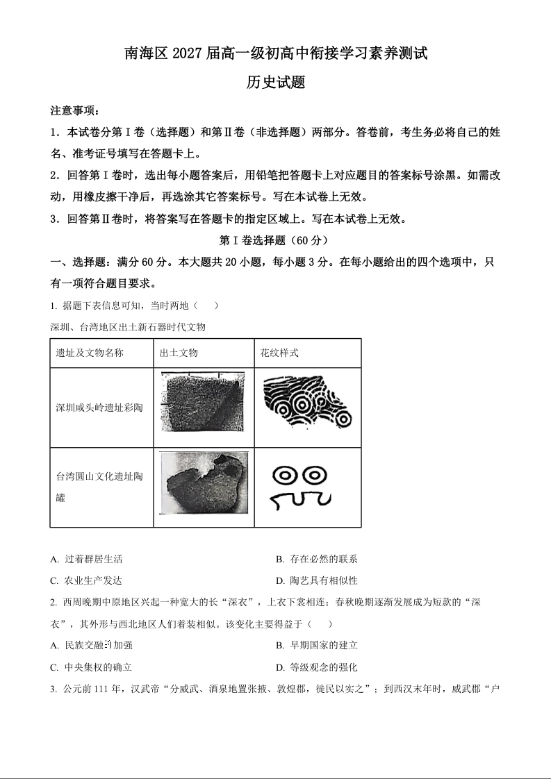 广东省佛山市南海区2027届高一级初高中衔接学习素养测试历史(原卷版)