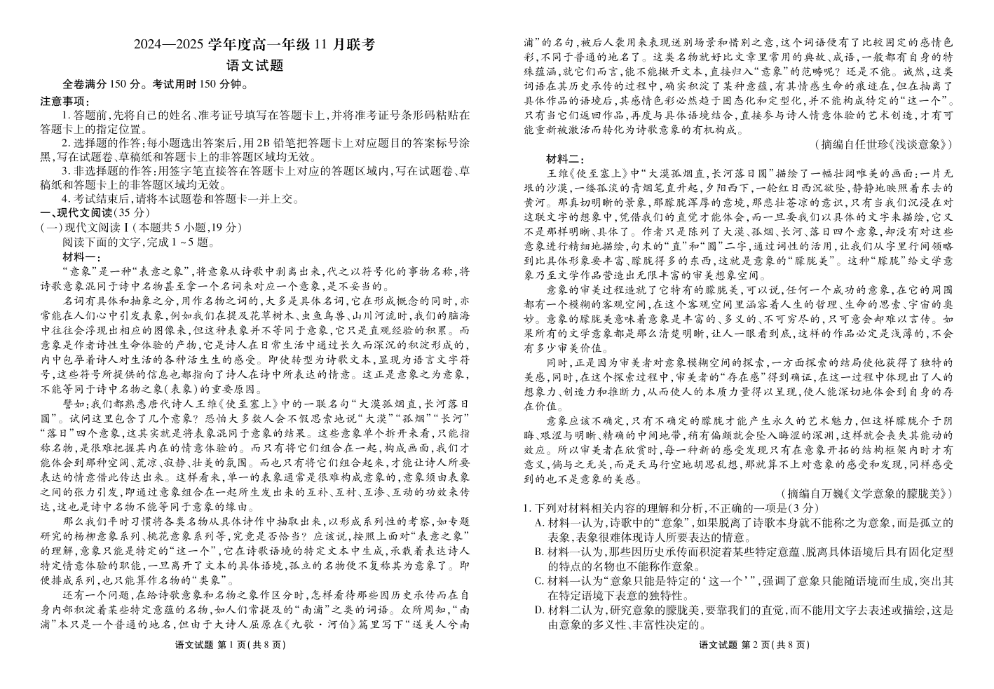 广东省衡水2024—2025学年度高一年级11月联考语文