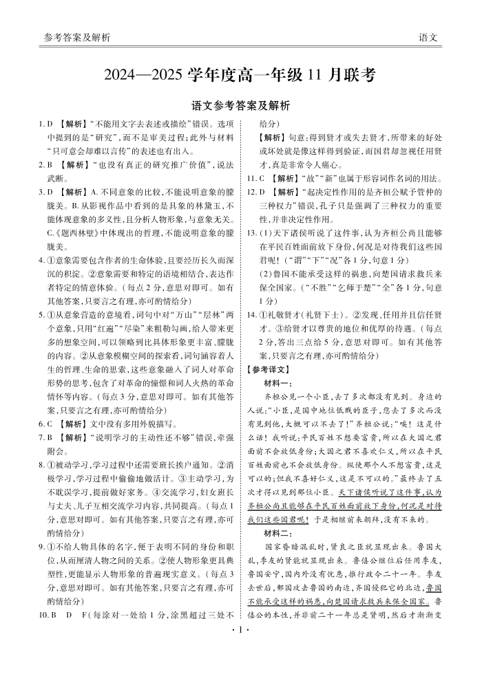 广东省衡水2024—2025学年度高一年级11月联考语文答案