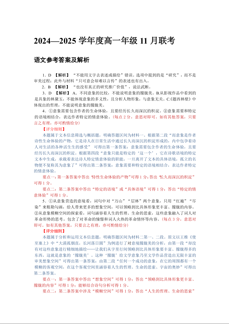 广东省衡水2024—2025学年度高一年级11月联考语文评分细则