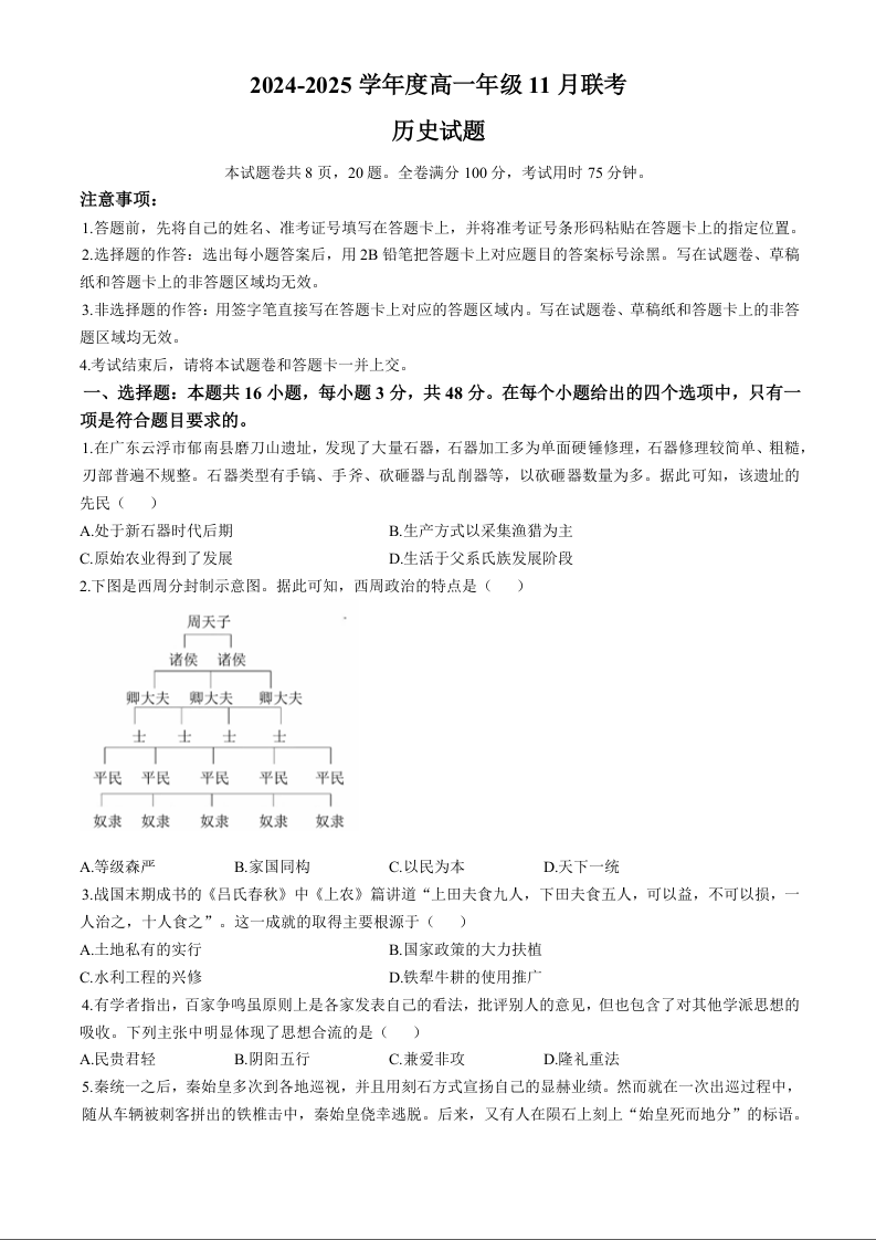 广东省衡水2024—2025学年度高一年级11月联考历史+答案