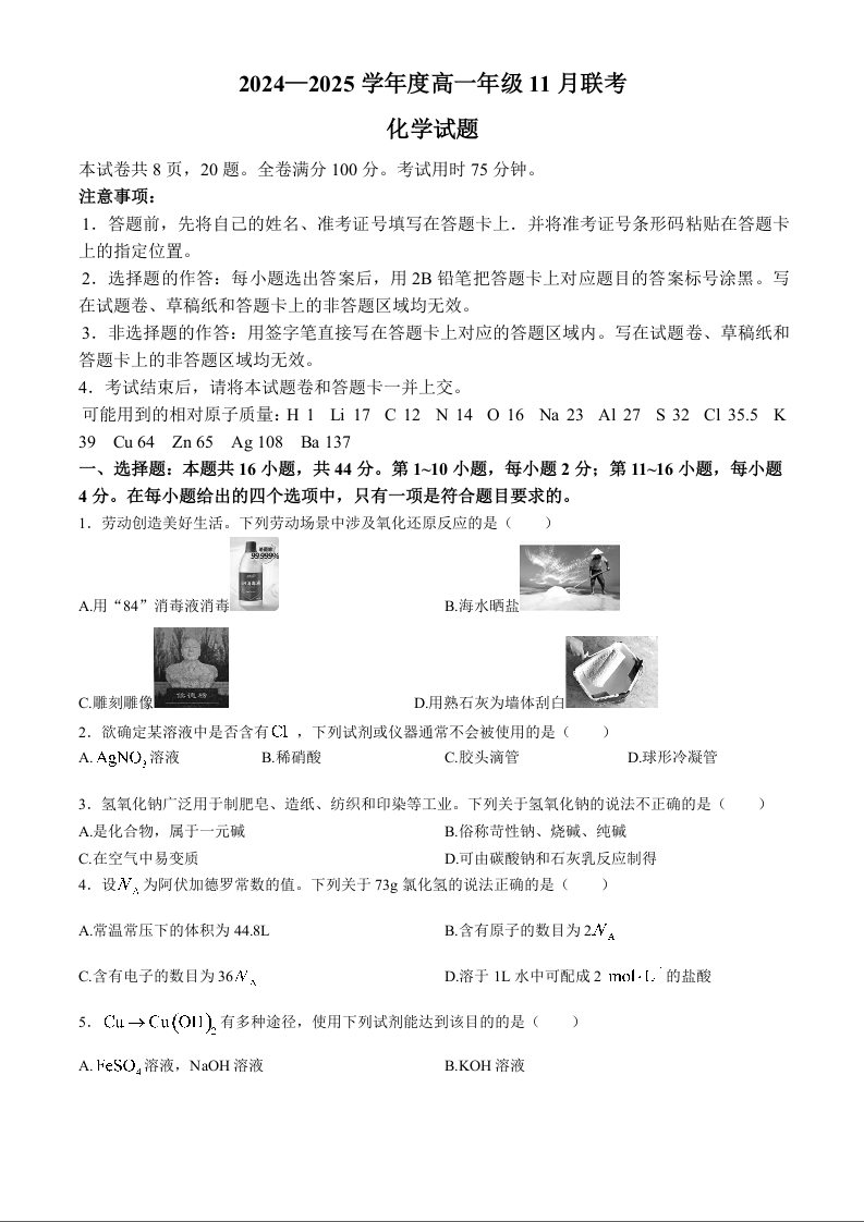 广东省衡水2024—2025学年度高一年级11月联考化学(含解析)