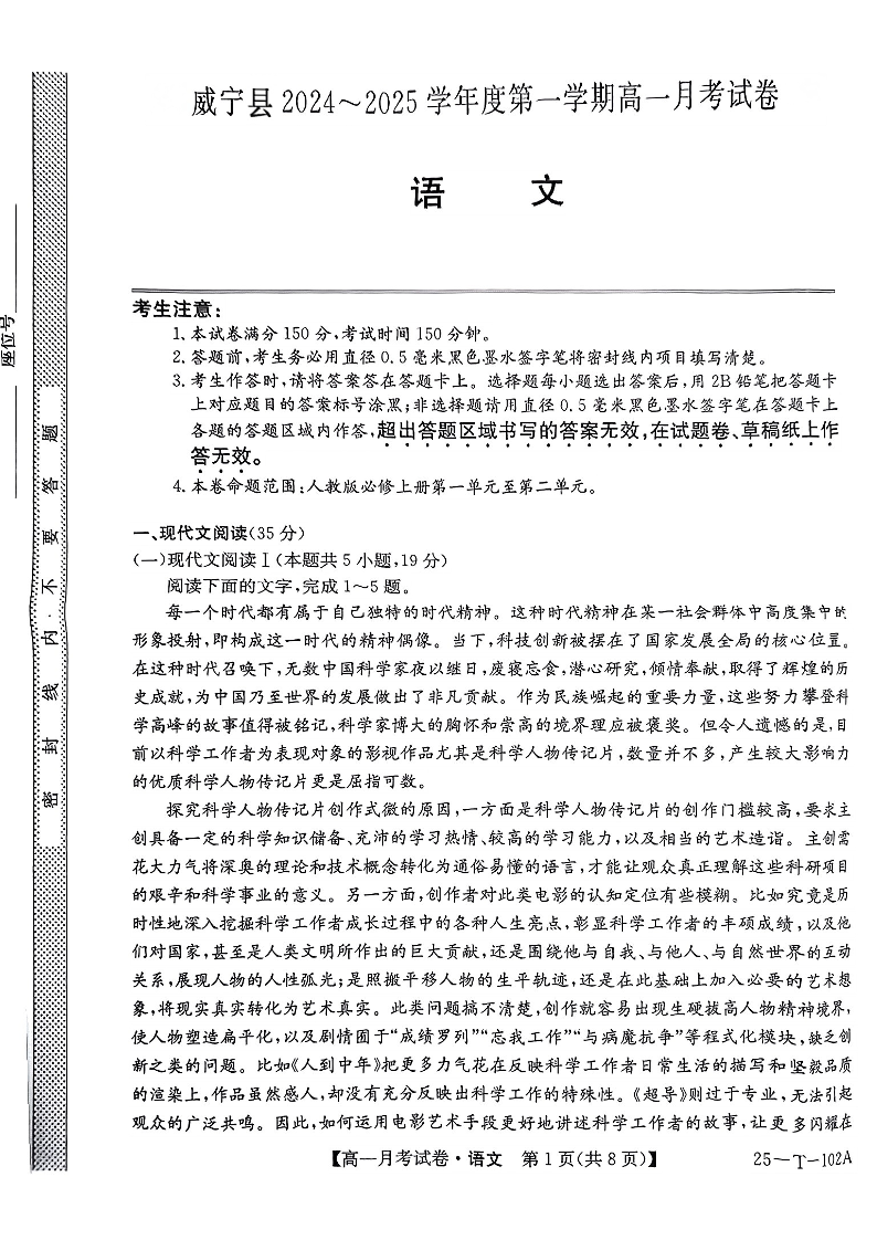 贵州省毕节市威宁县2024-2025学年高一上学期第一次月考语文