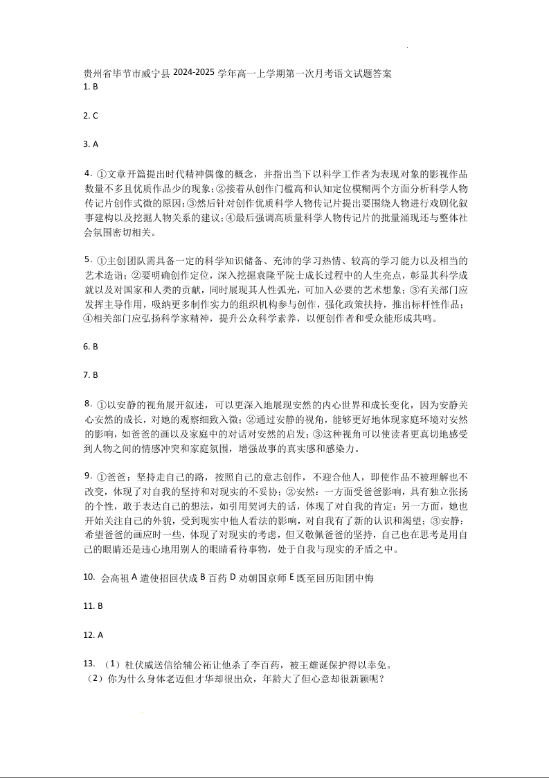 贵州省毕节市威宁县2024-2025学年高一上学期第一次月考语文答案